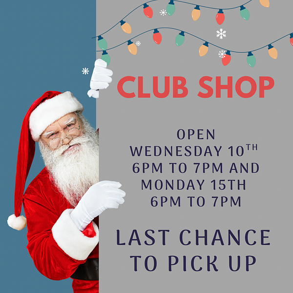 The club shop will open on Wed (10th) this week and Monday next week(15th) - these are last two days before Christmas. Please note these dates and make sure you call in to collect orders. The shop will not open any other times before Christmas.